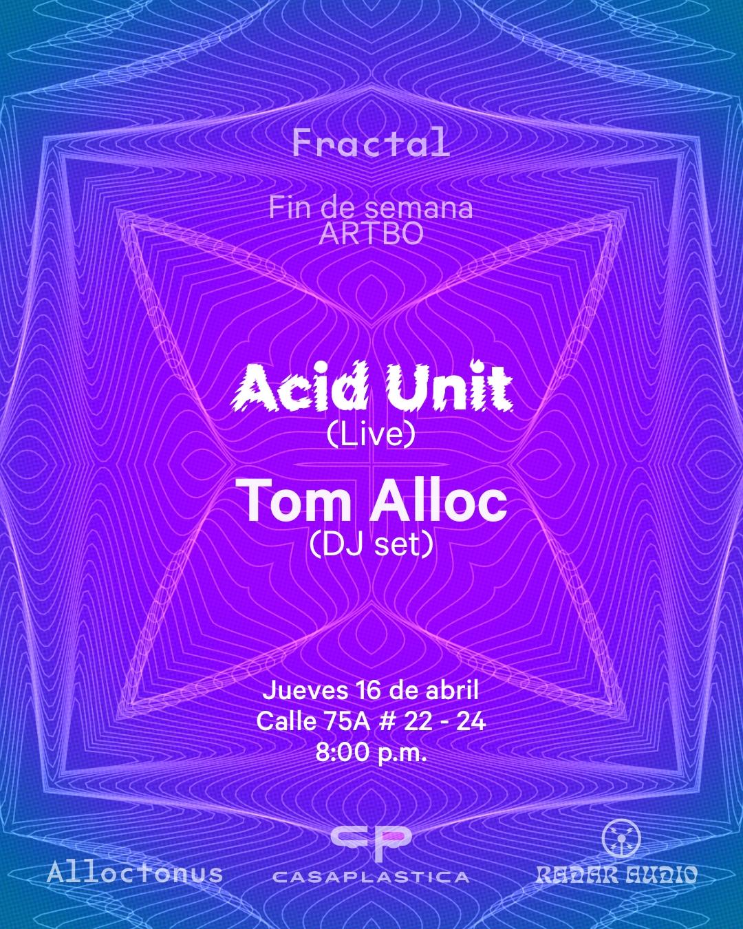Hoy jueves 16 de abril Acid Unit en vivo y Tom Alloc DJ set en el fin de semana ARTBO. Lugar: Calle 75A # 22–24 Casa Plástica, Barrio San Felipe. Hora: 8:00 p.m. Los esperamos!